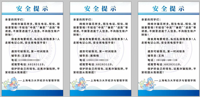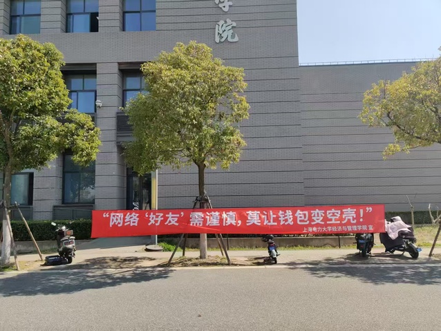 学院在校园主干道区醒目位置悬挂“警惕‘馅饼’变陷阱,远离诈骗保平安!”“网络‘好友’需谨慎,莫让钱包变空壳!”等宣传横幅,以简洁有力的标语提醒学生时刻保持警惕。同时,学院还通过微信公众号、班级群等线上平台推送防诈案例和反诈技巧,形成线上线下全覆盖的宣传矩阵。