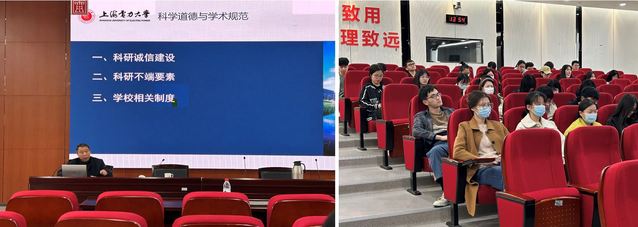 侯建朝从科研诚信建设、学术不端要素、学校相关制度三个方面进行了全面详细的阐述。他强调,科研诚信是科研工作人员必须具备的基本品格和恪守的道德底线,同学们要树立正确的科研行为导向,阐述了学术不端的具体要素及其对自身和社会产生的危害,并介绍了目前我校发布的关于科研诚信的相关政策,通过以上讲解呼吁同学们要严格自律,遵守学术规范,引导大家树立底线意识,规范学术学风行为,做到求真务实。