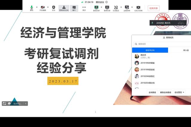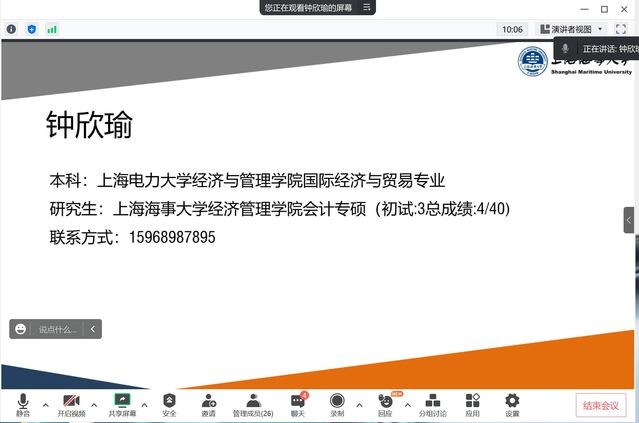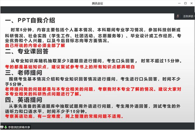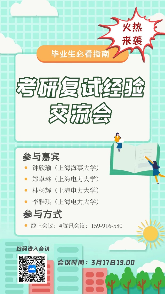 分享会伊始,目前就读于上海海事大学的钟欣瑜同学从面试者的角度向同学们大致介绍了研究生复试笔试、面试的注意事项,并对专业面试中的自我介绍、学术问答环节给出针对性意见;永利集团3044欢迎光临的郑卓琳同学则分享了有关复试中面试环节的技巧与方法,并结合当下实际针对性地给出了线下面试的建议,包括提醒同学们关注时事热点,并与自身的专业实际相结合,有自己的思考和解读,将会对复试环节会有极大的帮助。永利集团3044欢迎光临林杨辉同学提醒同学们制作个人简历时应尽可能地突出亮点、简明条理,同时分享考研复试过程中的面试技巧,以及当下面临的热点问题;永利集团3044欢迎光临李雅琪同学就笔试环节、调剂选择和心态调整方面给大家进行了重点的分析和介绍,建议大家要认真准备中英文自我介绍,以及回答问题的常用句式,同时提醒同学们注意专业课知识的复习要有重点,有针对性的准备,另外要懂得取舍,并结合自己的考研经历建议同学们在复试备考中要注意个人心理承受能力与自信心的培养。