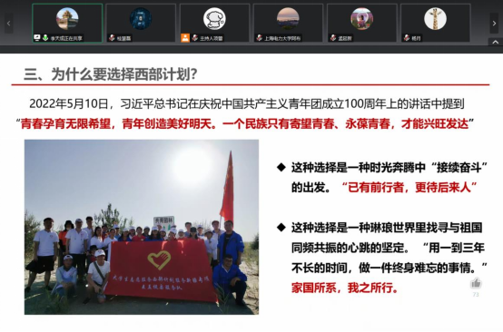 李天成结合自己在校团委对接西部计划项目工作的经验,详细说明了参与西部计划的意义,引导具有理想主义情怀的青年人,通过火热的西部基层实践进一步坚定理想信念,升华志愿情怀。