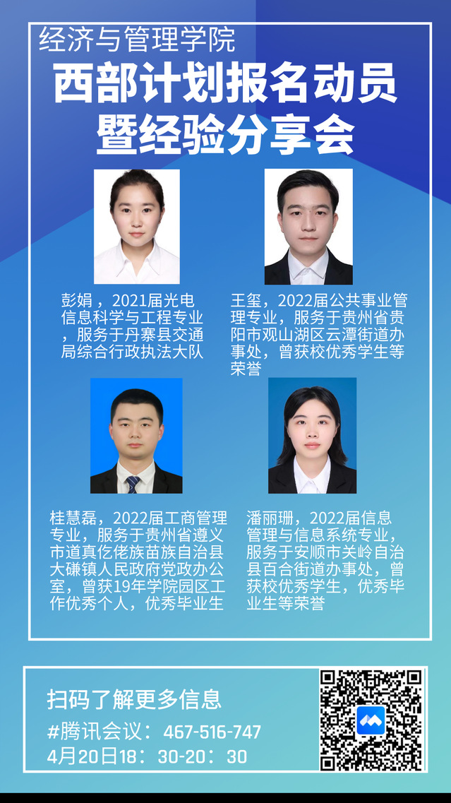 活动当天邀请到四位目前正在参与西部计划的优秀校友分享了在西部工作的经历和感悟。服务于贵州省遵义市道真仡佬族苗族自治县大磷镇人民政府党政办公室的桂慧磊感言到为乡村振兴做贡献,在基层为人民服务此生无悔。服务于丹寨县交通局综合行政执法大队的彭娟认为尽管会遇到困难和挫折,但参与西部计划时的志愿经历给了她不一样的体验。服务于贵州省贵阳市观山湖区云潭街道办事处的王玺对想要投身于基层服务的同学给予了针对性和指导性的建议。服务于安顺市关岭自治县百合街道办事处的潘丽珊分享了报名西部计划时的经验,提供具有参考意义的建议。他们都期待着应届生们能够坚定自己的理想信念,为基层事业奉献青年力量。