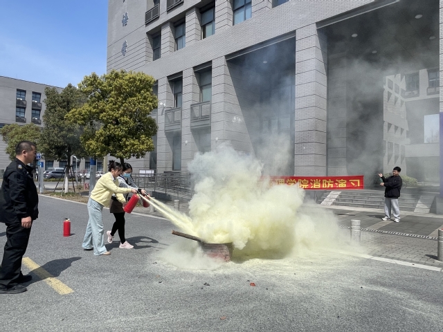 13:30分,消防演习总指挥学院党委书记张艺宣布了此次火灾疏散逃生演习正式开始。随着烟雾弹释放,火警警报响起,师生按指定方向有序撤离,逃生过程中师生掩住口鼻、弯腰前行、有序、小跑疏散。从火警警报响起到全员撤离到学院一楼安全区域,历时1分钟18秒,整个演练过程做到快速、安全、有序。撤离完毕后,消防专员现场讲解灭火器使用方法,并组织师生进行了灭火演习。