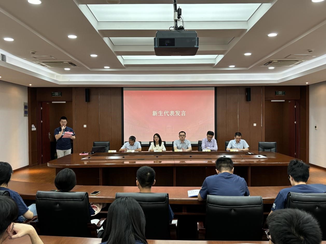 新生代表刘嘉玮发言。他表示新时代青年肩负使命与责任,呼吁同学们要坚定信念,明确目标;勤学善思,追求卓越;勇于实践,锤炼本领,为国家的科技进步和民族复兴贡献力量。他还表达了对未来学习的憧憬和决心,表示将珍惜这份来之不易的学习机会,铭记爱国、勤学、务实、奋进的校训,珍惜时光,刻苦钻研,广交英才,踏实前行,以最饱满的热情,最坚定的步伐完成学业。